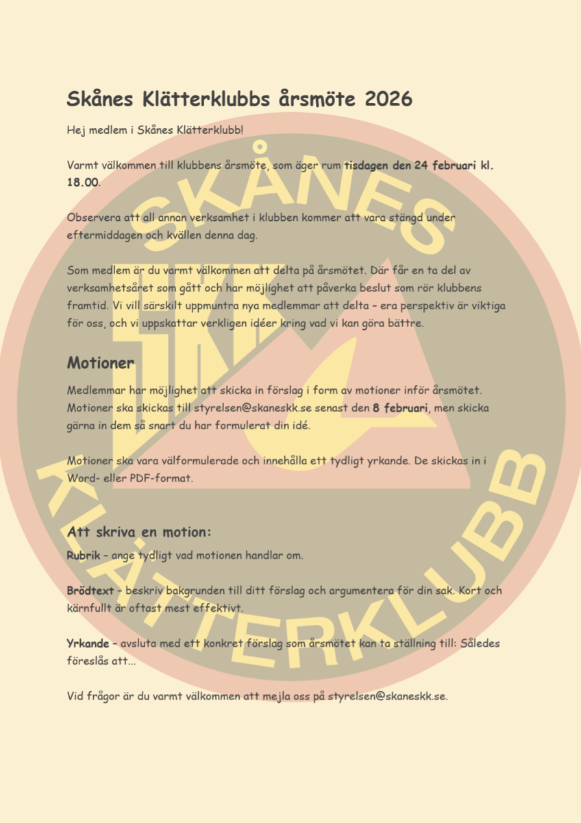 Inbjudan till Skånes klätterklubbs årsmöte 2026